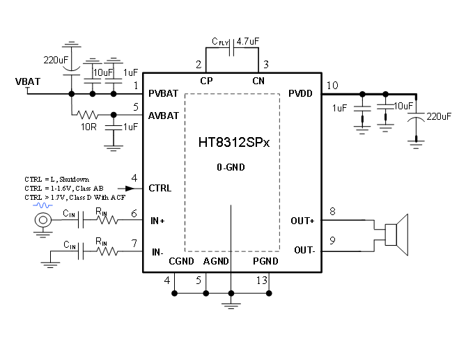 HT8312具有AB類和D類的自由切換功能,在受到D類功放EMI干擾困擾時,可隨時切換至AB類音頻功放模式(此時電荷泵升壓功能關閉)。