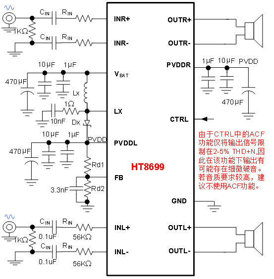 HT8699具有AB類和D類的自由切換功能,在受到D類功放EMI干擾困擾時,可隨時切換至AB類音頻功放模式。
