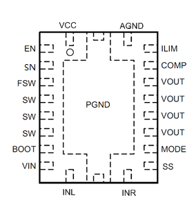 13 | MODE | I | 選擇輕載下的工作模式。該引腳懸空時,芯片為PFM模式;該引腳接地時,該芯片為PWM模式. |