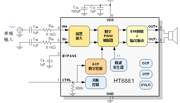 特點 防削頂失真功能(Anti-Clipping Function, ACF) AB類/D類切換 優異的全帶寬EMI抑制性能 免濾波器數字調制,直接驅動揚聲器 輸出功率 1.4W (VDD=3.6V, RL=4?, THD+N=10%, Class D) 2.8W (VDD=5.0V, RL=4?, THD+N=10%, Class D) 4.7W (VDD=6.5V, RL=4?, THD+N=10%, Class D) 2.5W (VDD=5.0V, RL=4?, THD+N=10%, Class AB) 高信噪比SNR:95dB (VDD = 6.5V, Av = 24dB, THD+N = 1%) 低靜態電流(D類) 2.65mA (VDD=3.6V) 3.25mA (VDD=5.0V) 4.00mA (VDD=6.5V) 低關斷電流:<1μA 過流保護及自動恢復功能 過熱保護、欠壓異常保護功能 無鉛無鹵封裝,DFN8L, SOP8和SOP8-PP