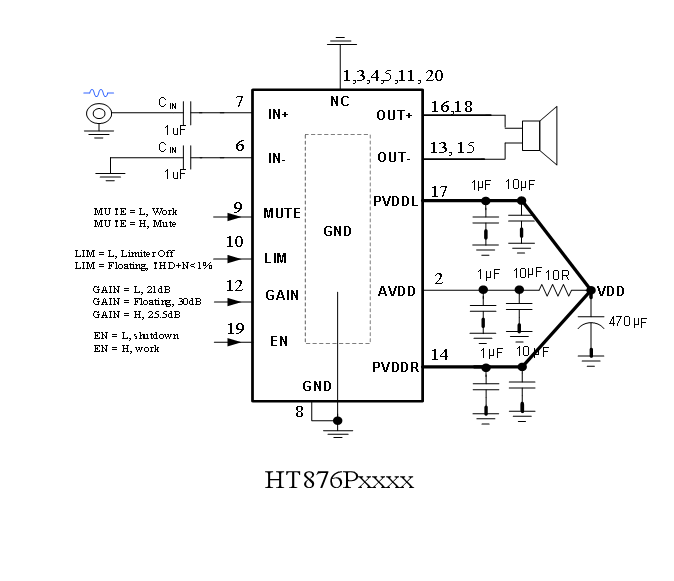 特點 可任意配置的限幅功能 自由選擇音頻限制幅度,使輸出音頻信號限制在固定失真水平內 內置自動限溫控制功能 支持并聯單聲道(PBTL) 支持AB類與D類切換 THD+N: 0.02%(VDD = 8.4V, RL = 4?, fIN = 1kHz, Po = 2×1.0W, BTL) 輸出功率(fIN = 1kHz, THD+N = 10%) 2×10.9W (VDD=9.0V, RL=4?, BTL) 18W (VDD=8.4V, RL=2?, PBTL) VDD供電范圍:2.5V至9.8V 多種增益選擇:21dB, 25.5dB, 30dB 免濾波器數字調制,直接驅動揚聲器 保護功能:過流/過熱/欠壓異常保護功能 無鉛無鹵封裝,TSSOP20L-PP | 應用 ?藍牙音箱/智能音響 ?便攜式音箱 ?2.1聲道小音箱 ?擴音器 ?iphone/ipod/ipod docking ?拉桿音箱 ?平板電腦,筆記本電腦 ?便攜式游戲機 ?小尺寸LCD電視/監視器 ?MP4, 導航儀 |
